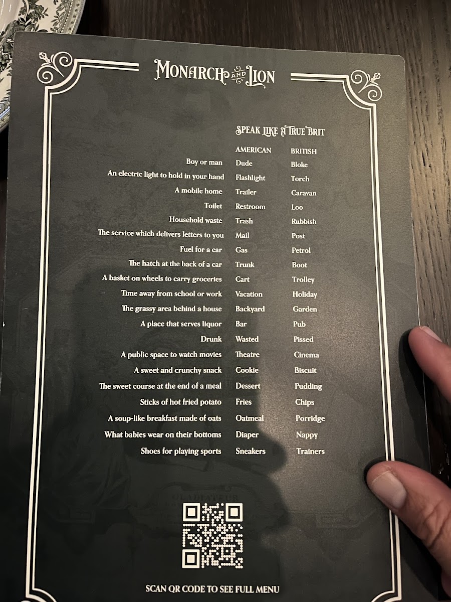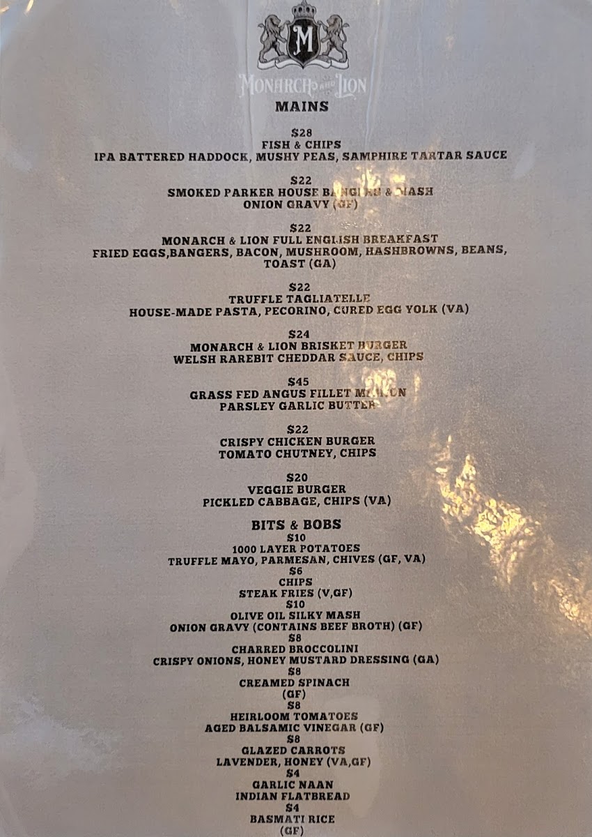 Monarch & Lion Menu